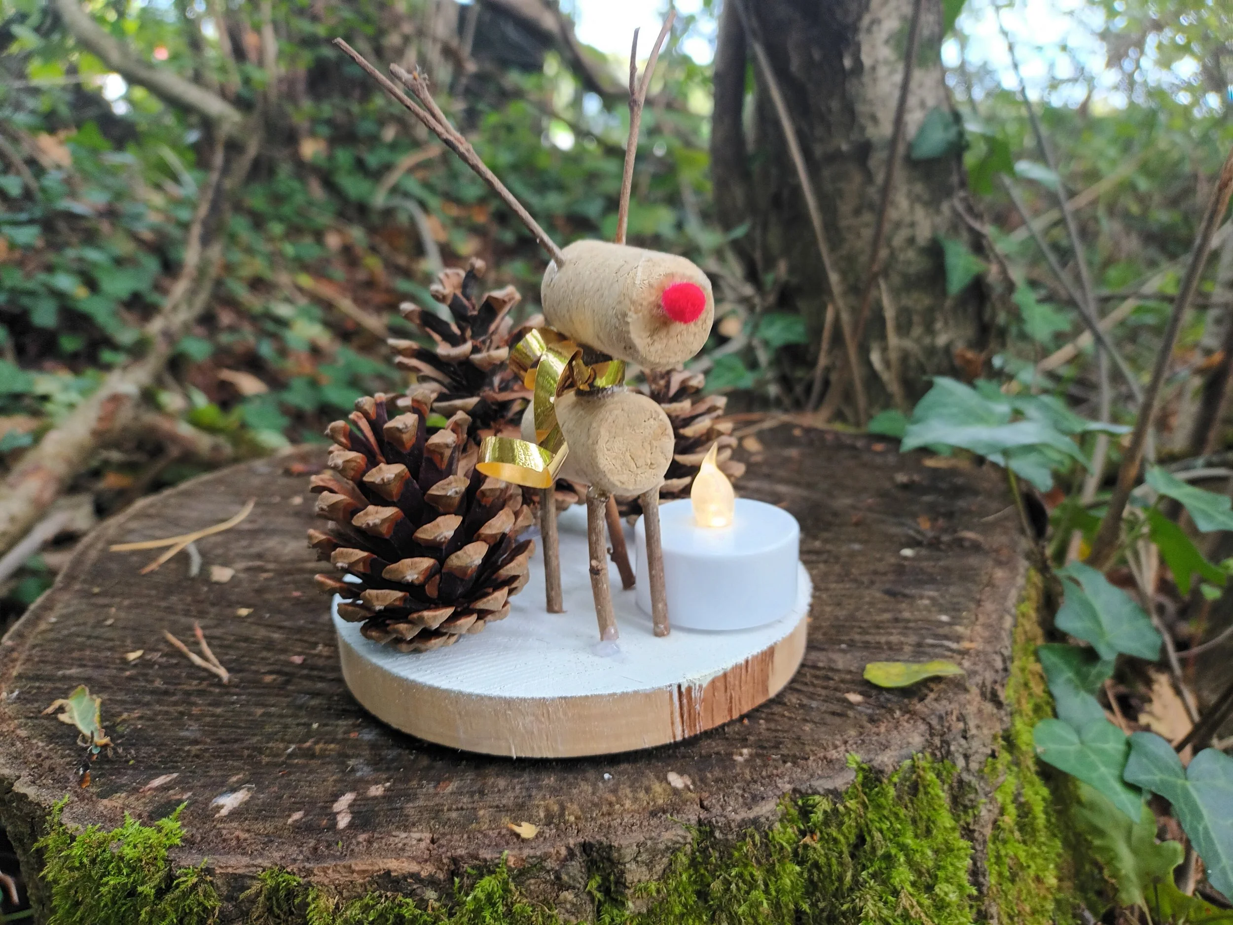 We will be making a festive table decoration using found natural materials, featuring a mini reindeer and tealight.
